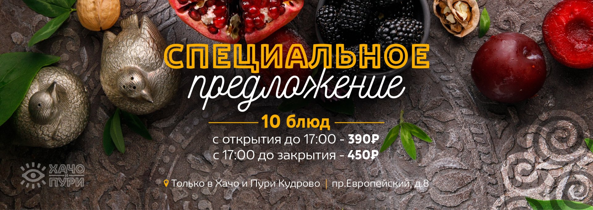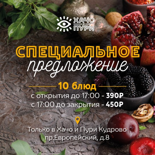 Специальное меню в Хачо и Пури Кудрово! 10 блюд с открытия до. 17:00 по 390р, с 17:00 до закрытия по 450р!