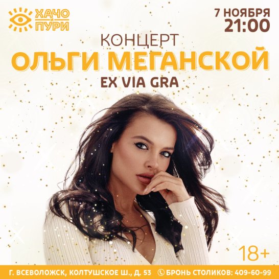 7 ноября в ресторане «Хачо и Пури» во Всеволожске выступит обворожительная Ольга Меганская (экс-солистка легендарной группа «ВИА ГРА)!