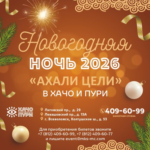Сказочная Новогодняя ночь 2026 в ресторанах Хачо и Пури! Яркая программа с ведущим, широкое застолье, подарки и призы!