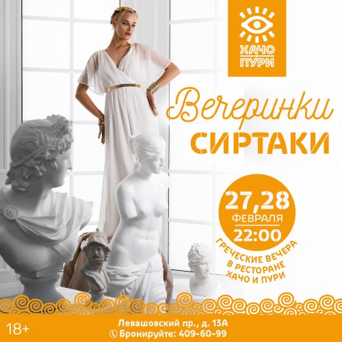Вечеринки в стиле Сиртаки 27 и 28 февраля в Хачо и Пури Левашовскй пр.13а! Поём в караоке и переносимся в Древнюю Грецию, танцуем Сиртаки! Бронь: 409-60-99