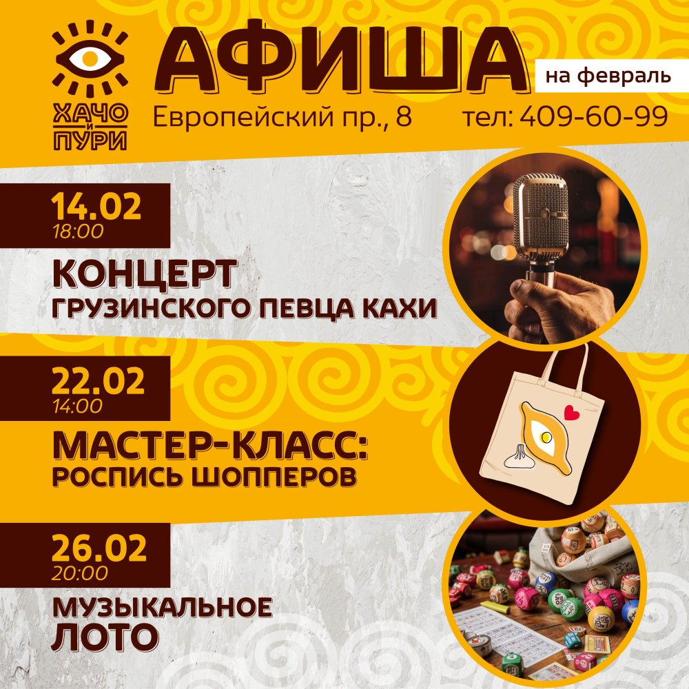 14 февраля - концерт грузинского певца Кахи с 18:00. Весь день - хачапури по-аджарски выпекаем парам в виде сердца и дарим парам комплементы в виде сердца.