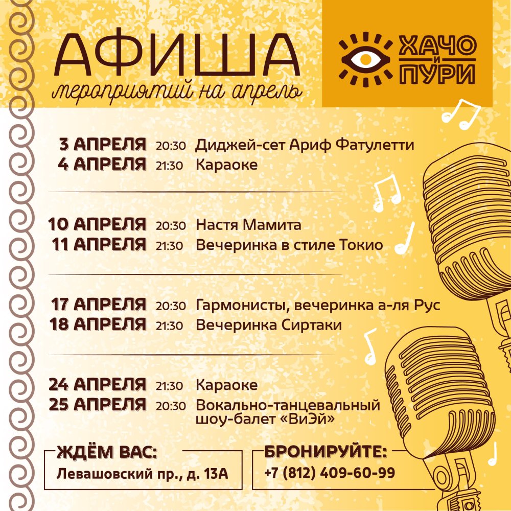 - 4 апреля: Спойте от души на нашем ярком караоке-вечере с харизматичным ведущим.