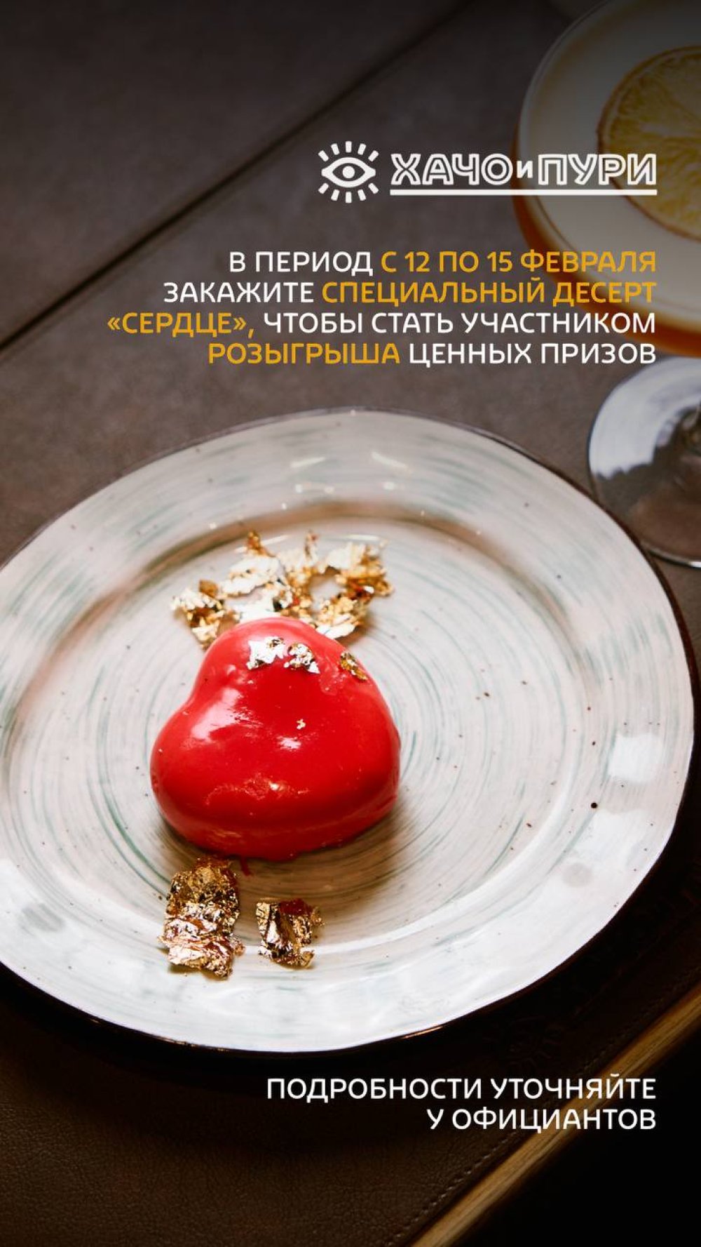 С 12 по 15 февраля при попкупке специального десерта - «Сердце» (590р), вы можете стать участником розыгрыша приятных призов от ресторана, подробности по тел.+7 (8412) 281-281 и у официантов.
